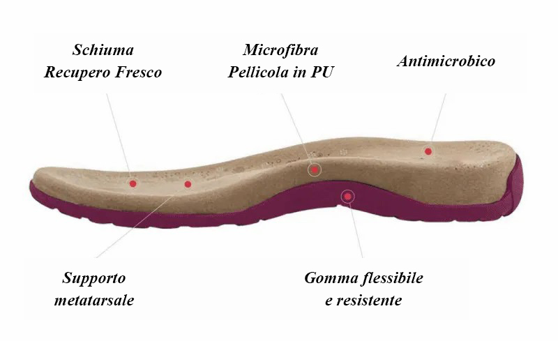 Dotata di un plantare in microfibra goffrata e trattata con protezione antimicrobica, mantiene i piedi freschi e asciutti, con un'imbottitura in gel morbida e rinfrescante su poliuretano per il massimo assorbimento degli urti. Le suole sono in gomma flessibile e resistente.