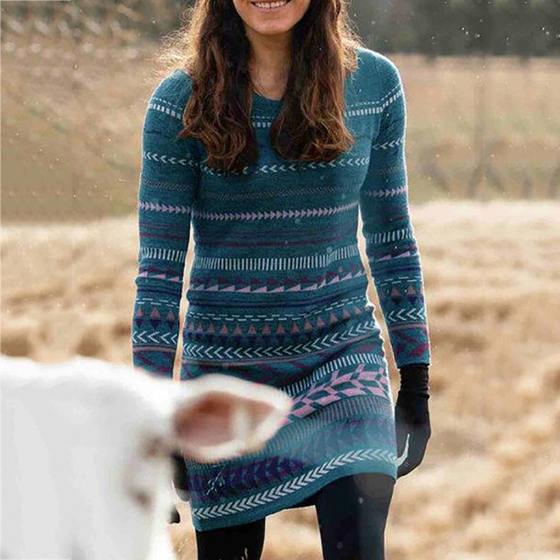 Vintage Ethnic Seal Stripe Print Knit Dress